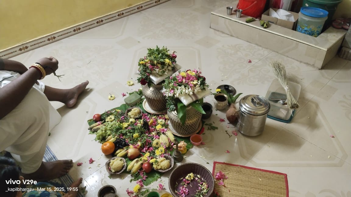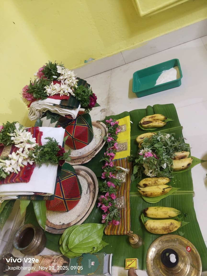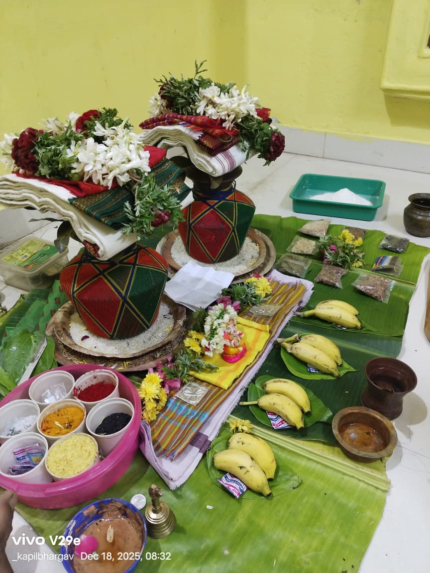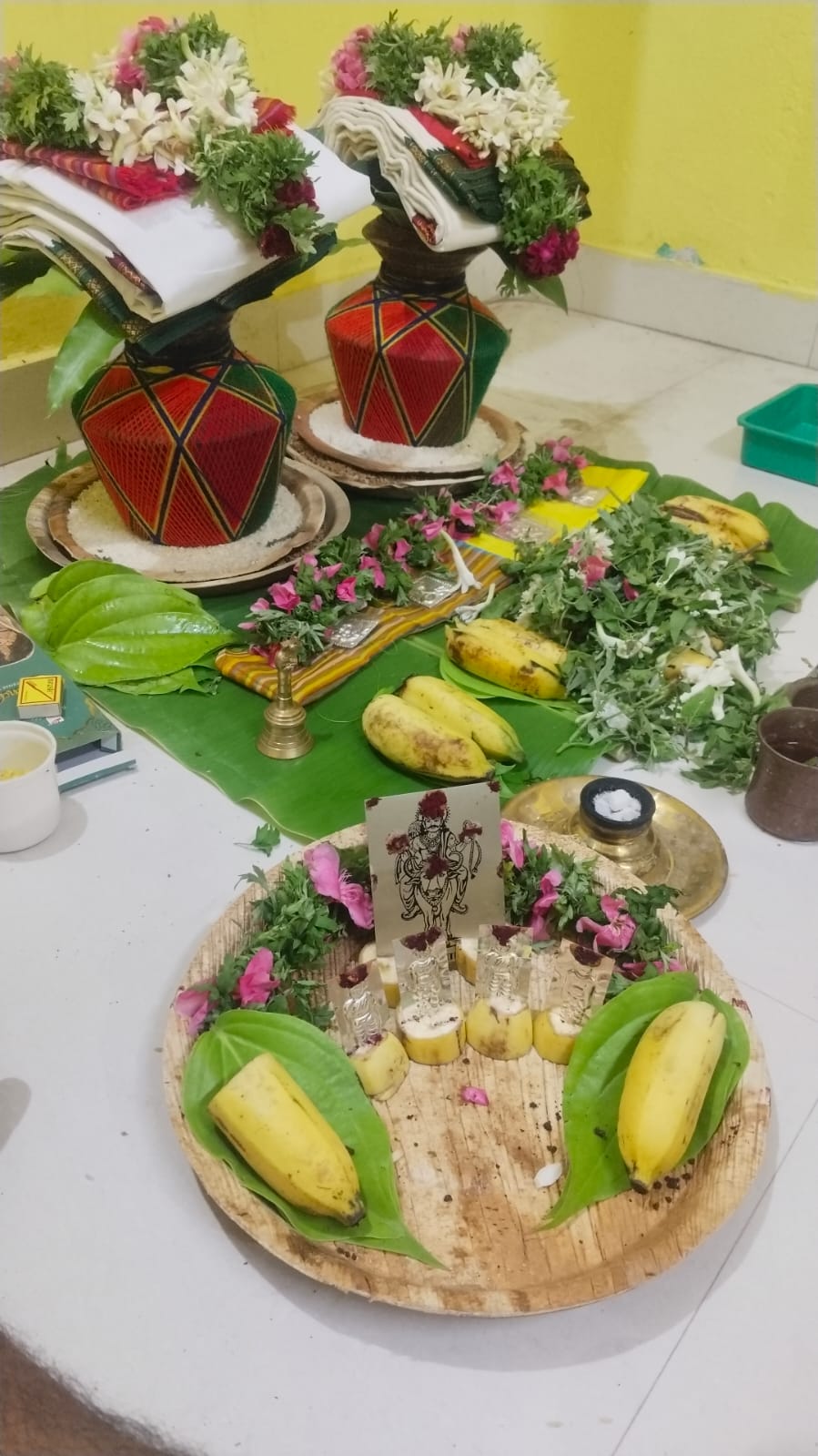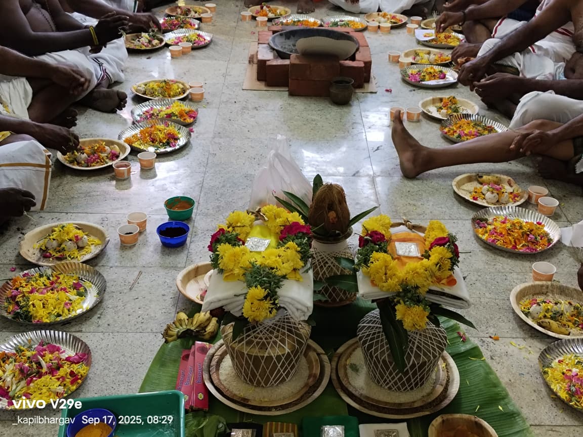 Inviting and performing pooja for Lord Vishnu&Lakshmi, Lord shiva & Parvati, Lord Adisheshar, Lord Shani Bhagvan, Lord Atharvana Bathirakali & Lord Kamadenu.