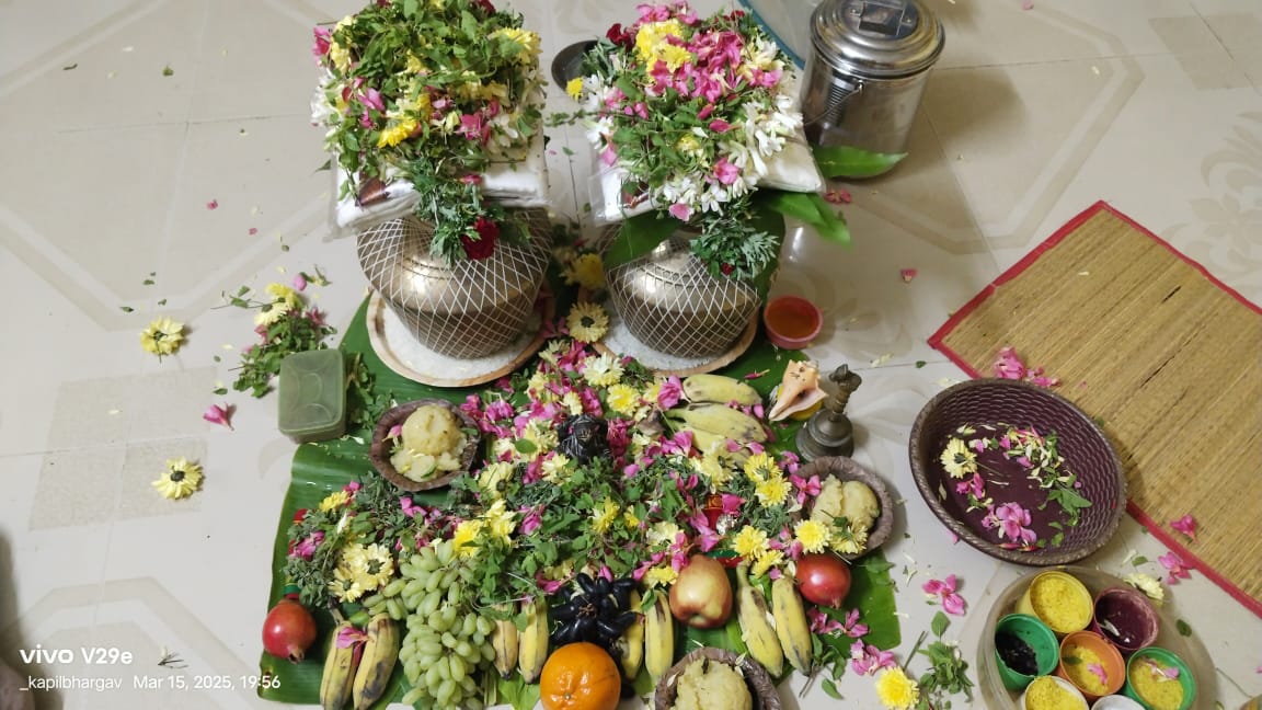 In this pooja, we worship Lord Varuna and sprinkle kalasha theertha for the sake of the purity of our mind, body and the puja surroundings.
